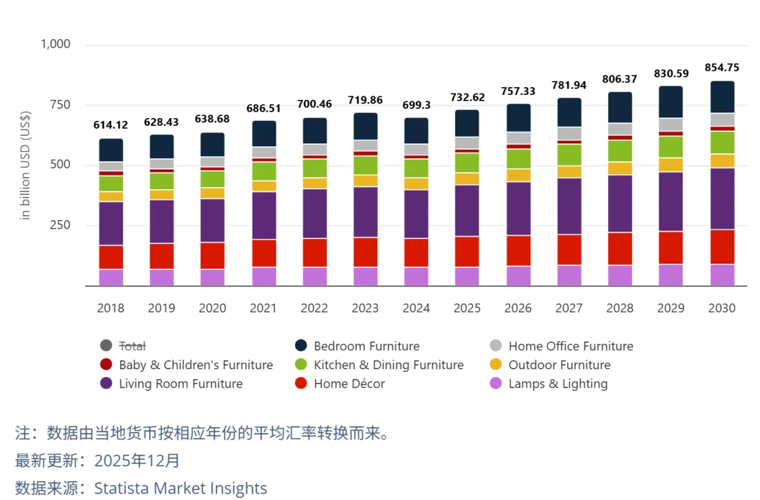 据Statista预测,2026年全球家具市场总收入预计将突破 7573亿美元,并保持稳健增长。其中,美国市场以超过 2655亿美元的预期收入继续领跑,德国、法国、英国等欧洲市场也展现出巨大的增长潜力。在这块千亿美元的大蛋糕中,客厅家具(如沙发、边桌、电视柜等)独占2234亿美元份额,不仅是市场的大头,更是卖家切入欧美家居生态的“核心流量入口”。