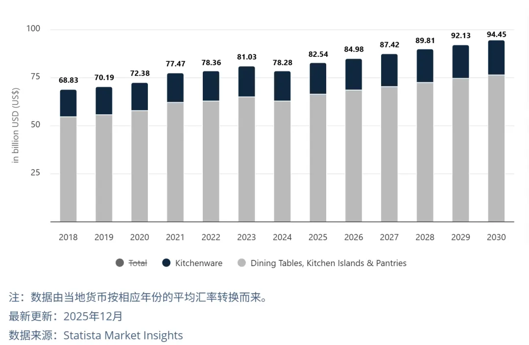 谁能想到,厨房与餐厅正从单纯做饭、吃饭的地方,转向家庭“第二社交中心”。2026年,全球餐厨市场预计将稳步迈入850亿美元大关。其中,美国依然是最大市场,预计贡献约387亿美元份额;欧洲高需求市场紧随其后。