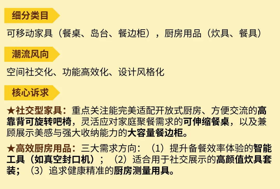 随着欧美家庭生活习惯的演变,厨房已经成为集烹饪、用餐与社交于一体的复合空间。无论是开放式厨房带来的家具需求,还是科技驱动的烹饪升级,都在重塑消费者的购物车。