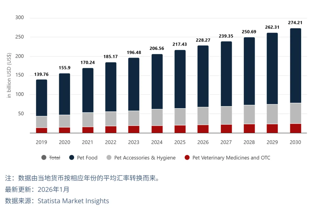 如果说家居是刚需,那么宠物及动物用品就是最具活动的“情感赛道”。 2026年,全球宠物市场总收入预计将攀升至 2282亿美元,年复合增长率显著;其中仅美国市场就占据了980亿美元。从细分类目看,宠物食品仍是最大板块,但宠物家居用品、智能设备及健康护理产品的增长势头尤为强劲。