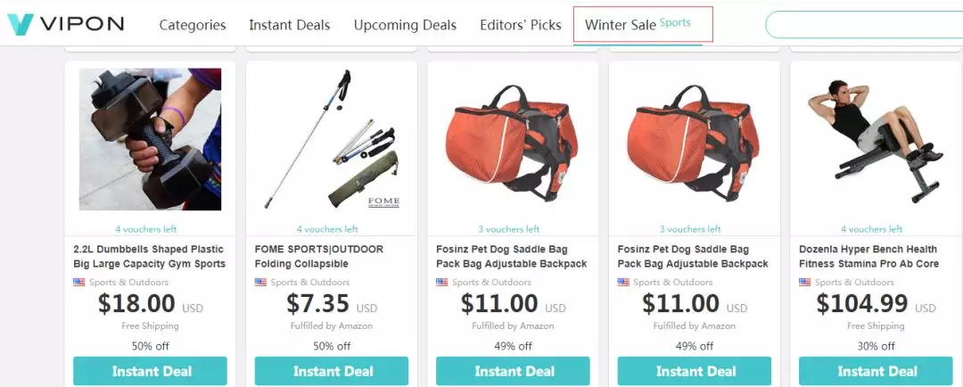 Vipon平台正在Winter Sale专区开展Sports&Outdoors的专题活动,已在本类目上车的亚马逊卖家欢迎在AMZTracker的后台提报产品,参与活动。助你在激烈的竞争中,快速推广产品! 本次Sports&Outdoors的专题活动的持续时间是1.22-1.28,Winter sale活动将继续开展至2月28日。 请记住以下活动主题和更新时间: 1.8-1.14 Under $5—5美金以下商品 1.15-1.21 Beauty—美妆类产品 1.22-1.28 Sports & Outdoors-户外运动产品 1.29-2.11 Valentines’ Gifts—情人节礼品类 2.12-2.18 Home & Kitchen—家居装饰厨房用品 2.19-2.25 Electronics—电子产品 2.26-2.28 Under $10—10美金以下商品