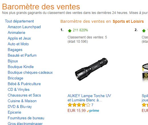 其中户外照明类产品相比其他站点,FR站点的需求更多,照明类手电筒和挂式照明工具在Best Seller榜单中多次出现,也赫然占据Movers&Shakers榜单的首位。