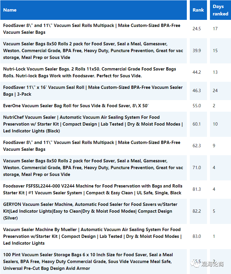 过去30天,亚马逊上真空食品保鲜相关产品的排名变化。