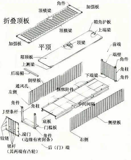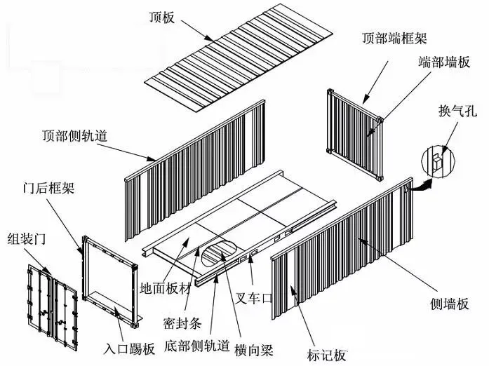 集装箱的结构主要分为以下几个部分:钢框架、构成箱体围护的波浪形侧墙板、地板及其附加梁,开启门扇及其附属部分、以及各装卸用构件。各种组成部分相互焊接,形成了具有完整独立的盒子结构体。