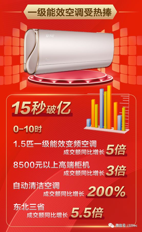 京东家电所有品类全面爆发:空调品类成交额仅用15秒即破亿元,截至1日上午10点,1.5匹一级能效变频空调成交额同比增长了5倍,8500元以上的高端柜机成交额同比增长了3倍,具备自动清洁功能的空调成交额同比增长200%,东北三省以成交额同比增长5.5倍成为增幅最高的市场。盛夏将至,空调成为当仁不让的家电主角。