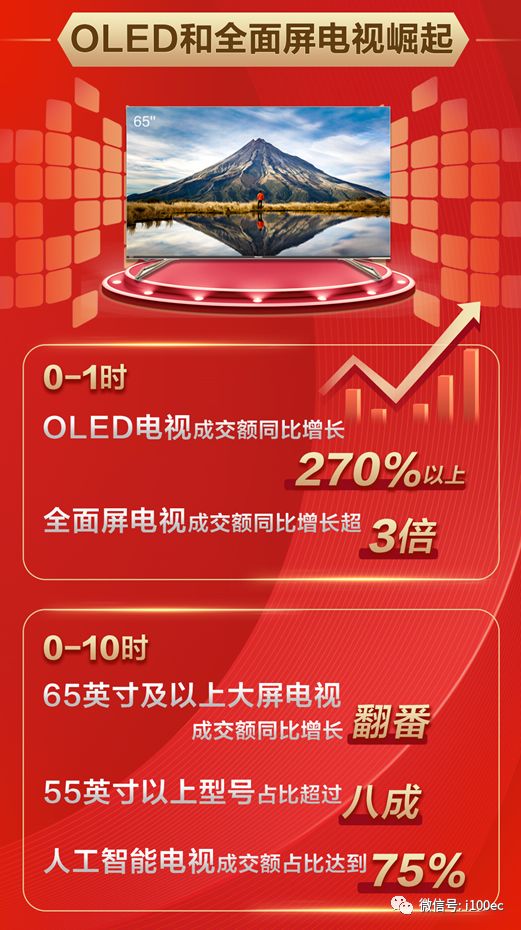 消费者对显示新技术的追捧永不停止:电视品类代表未来技术方向的OLED电视销售暴增,0点后的前一个小时成交额同比增长270%以上,这距离5月17日京东联合主流电视品牌成立OLED联盟刚刚过去半个月。全面屏电视在第一个小时的成交额同比增长超3倍。截至1日上午10点,65英寸及以上大屏电视同比增长翻番,销售前十的产品中55英寸以上型号占比超过八成,电视机的大屏化趋势一目了然。人工智能电视的成交额占比达到75%,AI人工智能正在全面渗透到现代生活中。