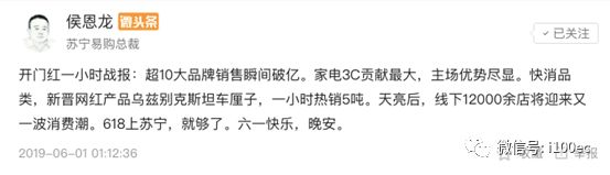 6月1日凌晨,苏宁易购总裁侯恩龙在微头条上公布了苏宁开门红一小时战报:“超10大品牌销售瞬间破亿。家电3C贡献最大,主场优势尽显。快消品类,新晋网红产品乌兹别克斯坦车厘子,一小时热销5吨。天亮后,线下12000余店将迎来又一波消费潮。”