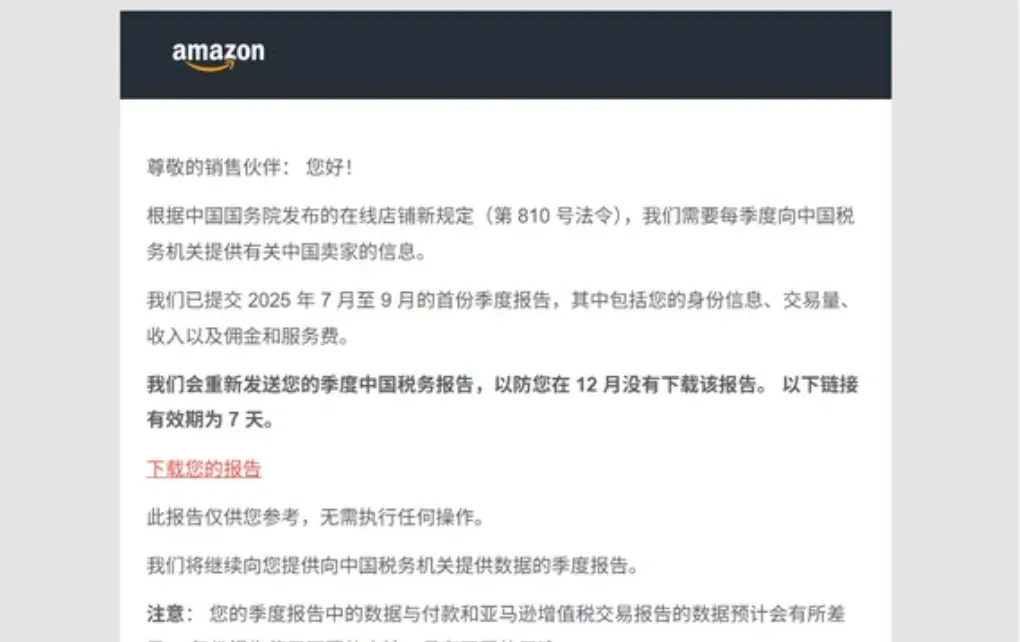近日,亚马逊平台也重新发送了2025 年第三季度(7 月 - 9 月)中国税务报告邮件。