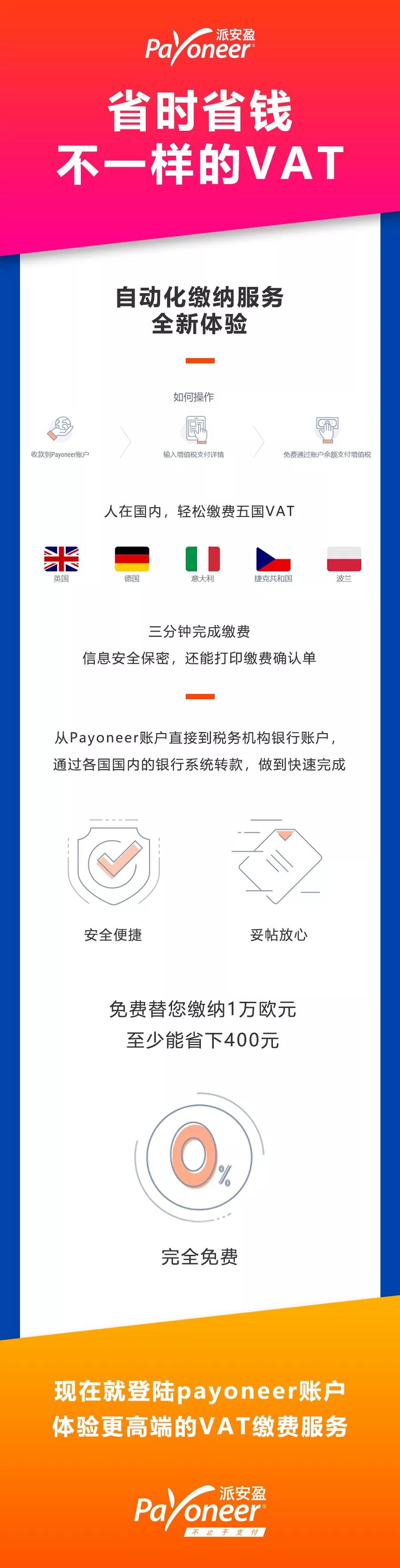 Payoneer早在2017年初,就推出了免费的VAT缴费服务,Payoneer VAT凭借其当天即可处理的时效以及无需提供税表资料等便捷优势,为卖家朋友们大大提高缴费时效、降低VAT成本: