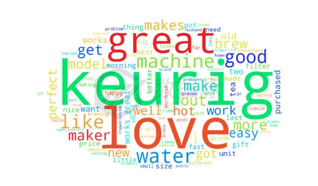 除去词汇“coffee”,在所有的买家评论中,品牌“keurig”一词出现次数最多,达到2429次;其次是表达喜爱的词汇“love”(1756次)和“great”(1275次);涉及到水箱或者注水等操作的词汇“water”出现了1091次;此外,买家提到较多的词汇还包括“easy”(433次)、“convenient”(187次)、“fast”(241次)等表示使用简单快捷的词汇;表示使用时间的词汇“morning”出现290次;除了用于制作咖啡,也有部分顾客关注泡茶功能,“tea”这一词汇出现了326次;表示买来最为礼物的词汇“gift”出现了286次;价格“price”(273次)也是大家关注的热点。