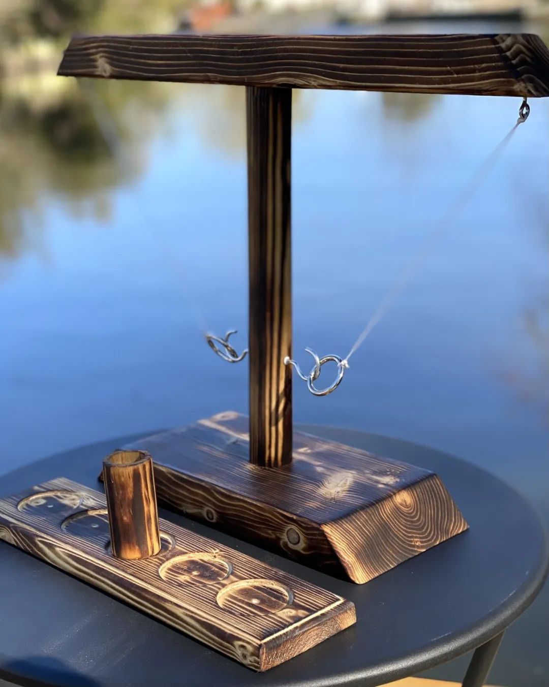 这个吊环投掷游戏的玩法就是由两名玩家投掷圆环,谁投到挂钩上就可以把圆柱体的目标物向对方移动一格,谁先到达对面就获胜了。