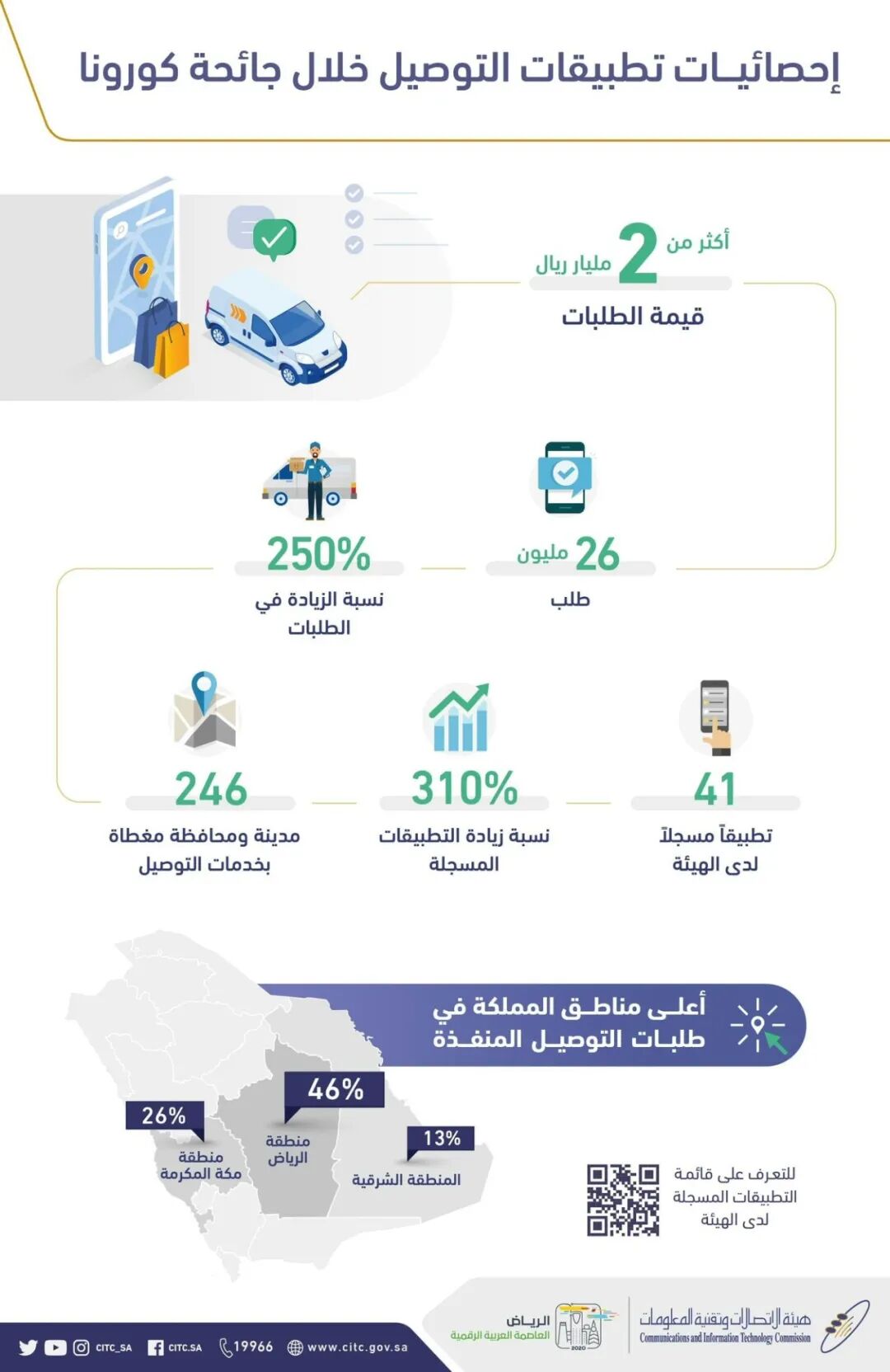 通信和信息技术委员会透露,自大流行以来 , 通过申请交付的财务申请的总价值超过了20亿里亚尔,并指出总订单为2600万,比疫情开始增加了250% 沙特当局表示,利雅得地区获得了全部交付请求的46%,其次是麦加穆卡马拉玛地区(占26%),而东部地区则执行了13%。 该报告还显示,自宵禁实施以来,向其注册的送货申请数量有所增加,在总共达到41份申请之后,改善率达到310%,为沙特阿拉伯各地区的246个城市和省提供送货服务。 值得注意的是,自冠状病毒大流行开始以来,传播委员会已与许多政府机构合作建立了准确的治理机制,以通过建立控制和监管框架来确保这项重要活动的有效性;从组织和运营的角度来看,提高其运营效率,提高其容量并验证连接应用程序;为了适应流行病爆发以来对各种应用程序不断增长的需求,通过重组交付应用程序部门的工作并使之成为管理局的主要目标之一,与商务部进行联合和建设性合作,发起一项旨在将供应商店,药房和医疗用品商店与在管理局注册的交付应用程序联系起来的倡议; 为了确保受益人的需求能够轻松地送到家中。 在今年7月,沙特通信和信息技术委员会要求沙特王国的所有有执照的邮政服务提供商有义务在其所有网点和与所有递送代理商一起提供电子付款方式。 本文译者:中东跨境电商汇 原文来自citc.gov.sa 欢迎转载,请注明出处
