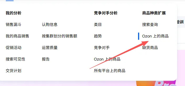 打开Ozon卖家后台,顶部菜单栏找到“分析”,然后点“热门商品”。