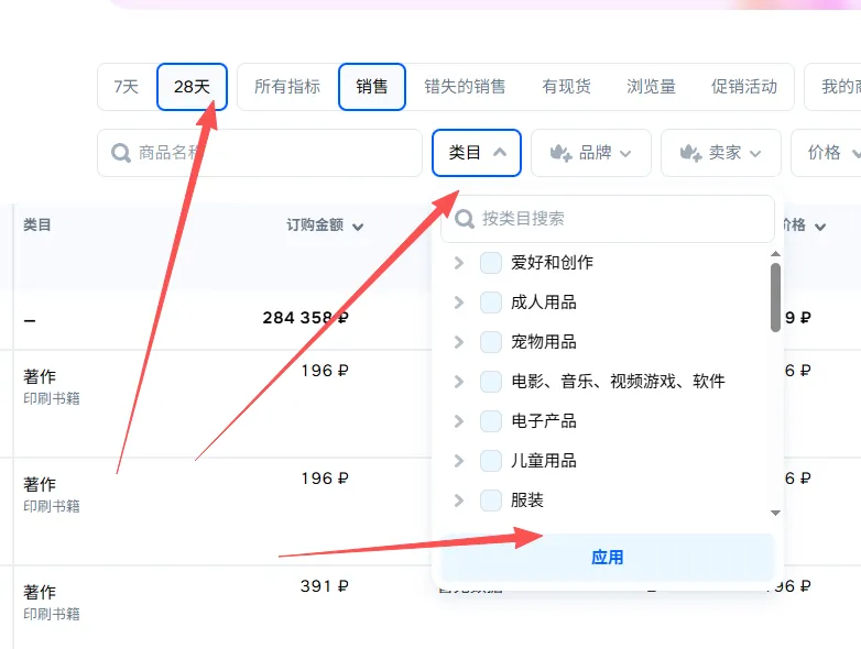 进入页面后,左侧时间范围选“28天”(数据更稳)。接着在“类目”那里,按我们刚才说的,如果是“电子产品”这种大类,你就一路点选到三级子类目;如果是“乐器”这种小类,选到二级子类目就行,可以多选几个,然后点“应用”。