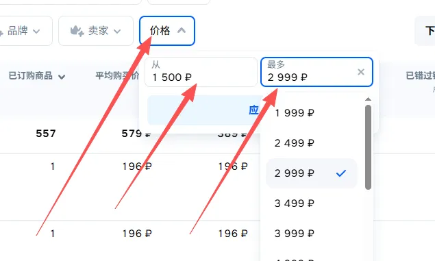 接着,在左侧“价格”区间那里,填上1500到3000卢布,再点“应用”。