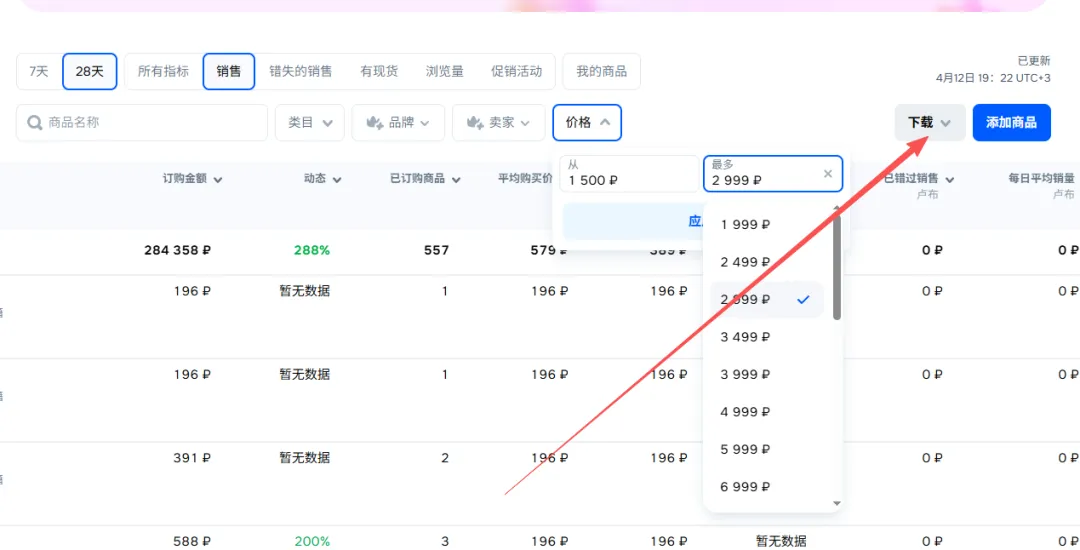 下面就会筛选出一批商品。这时候,点击页面上的“下载”按钮,选择“包含所有设置的报告”,系统就会生成一份详细的表格给你。
