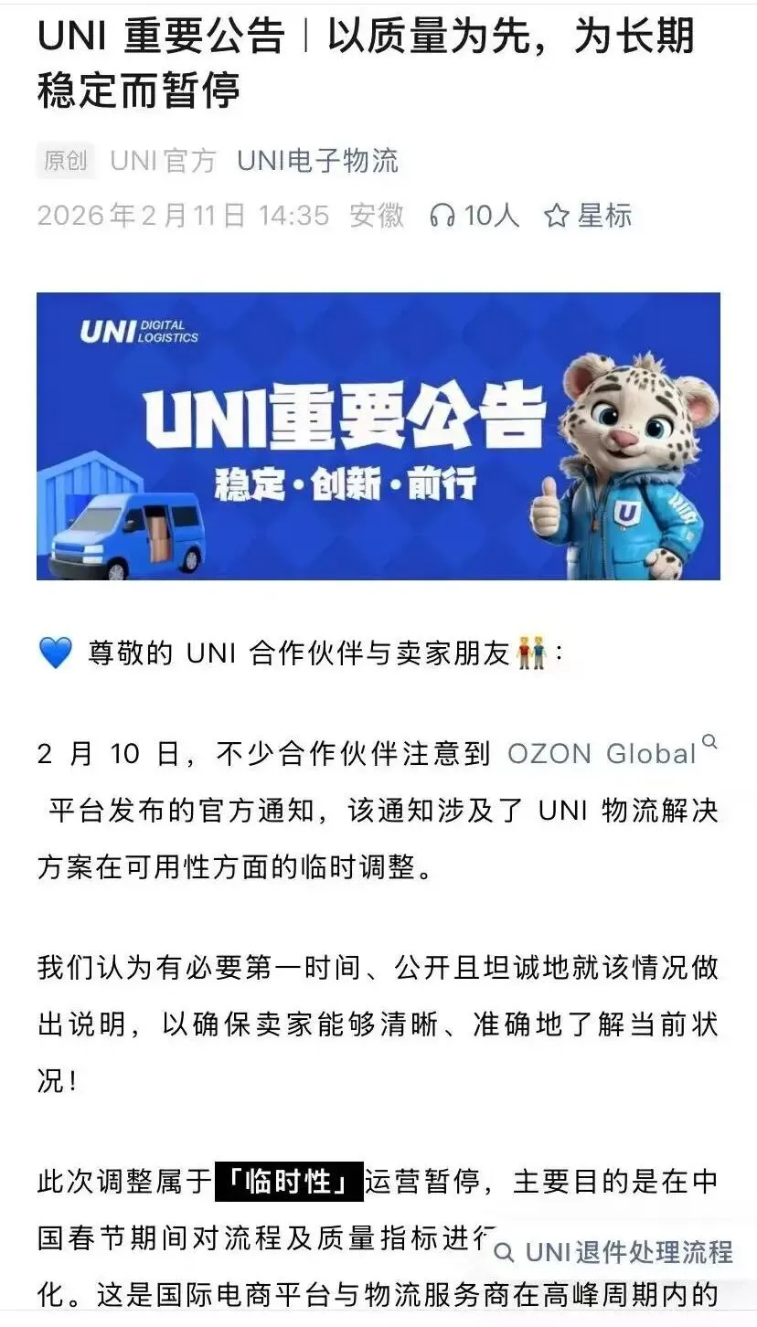 俄罗斯电商平台Ozon宣布,从2月10日开始正式终止与物流服务商 UNI (Unitrade) 的合作关系!对于Ozon卖家而言,这是一个重大的变化,他们不得不停止使用UNI物流,重新选择新的物流合作。