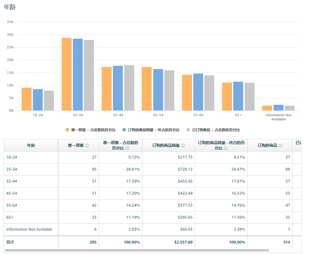 人数统计报告可以向品牌所有者提供买家画像 。人口统计报告会显示与品牌所有者成功注册亚马逊品牌注册计划的品牌相关的所有商品。其按年龄、家庭收入、教育、性别和婚姻状况划分的明细(汇总信息)。