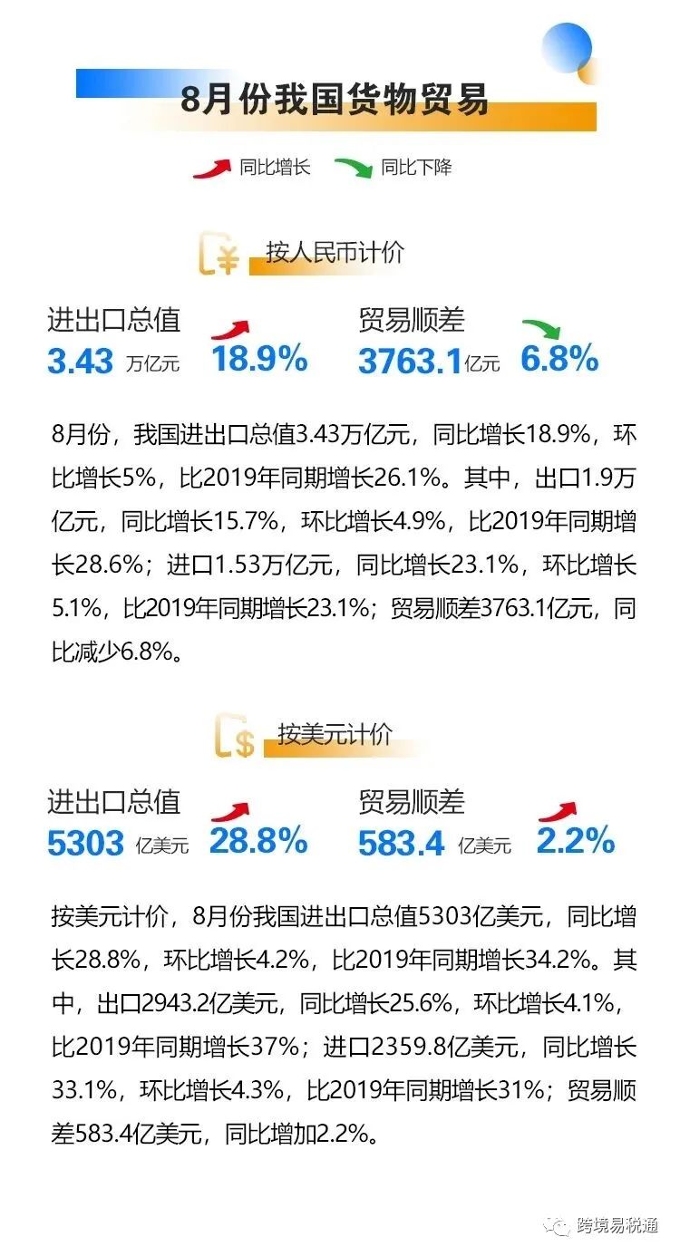 8月份,我国进出口总值3.43万亿元,同比增长18.9%,环比增长5%,比2019年同期增长26.1%。其中,出口1.9万亿元,同比增长15.7%,环比增长4.9%,比2019年同期增长28.6%;进口1.53万亿元,同比增长23.1%,环比增长5.1%,比2019年同期增长23.1%;贸易顺差3763.1亿元,同比减少6.8%。按美元计价,8月份我国进出口总值5303亿美元,同比增长28.8%,环比增长4.2%,比2019年同期增长34.2%。其中,出口2943.2亿美元,同比增长25.6%,环比增长4.1%,比2019年同期增长37%;进口2359.8亿美元,同比增长33.1%,环比增长4.3%,比2019年同期增长31%;贸易顺差583.4亿美元,同比增加2.2%。
