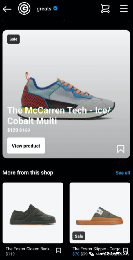 例如,下图的@greats Instagram 商店拥有这家运动鞋零售商提供的数十种款式。客户可以点击查看应用程序中的定价和产品规格,然后可以点击在公司网站上完成购买。