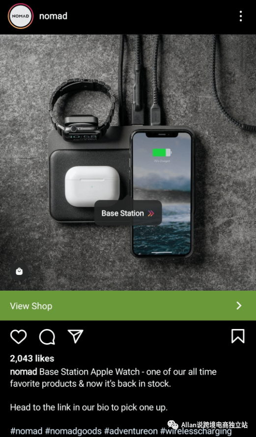 例如,下面的@nomad Instagram 帖子展示了一个带有彩色徽章的可购物产品,表明应用内结账可用。客户可以在不离开应用程序的情况下点击帖子进行购物和购买。