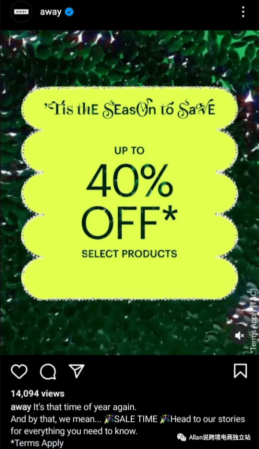 例如,下面的@away Instagram 帖子突出显示了季节性销售。标题提示客户通过访问旅游品牌的故事来获取详细信息——这是宣传临时活动的理想场所。