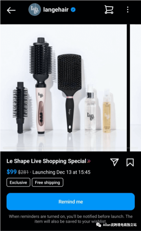 例如,下面的@langehair drop 以独家价格提供了一套新的发刷。用户可以点击保存产品、通过直接消息分享或获得提醒。产品发布后,客户可以直接在 Instagram 上购买。