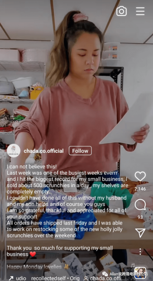 下面的@chada.co.official reels庆祝创作者在业务中最重要的日子之一。reels展示了忙碌一天的幕后花絮,而标题则感谢客户的支持。标题还列出了销售数量,提供了一种可能推动额外转化的社会证明。