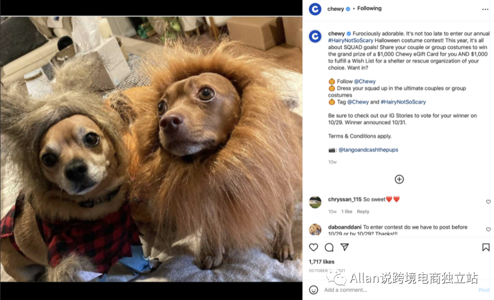 例如,这篇@chewy 帖子宣传其一年一度的万圣节服装比赛,要求用户标记@chewy 并使用#HairyNotScary 标签进入。