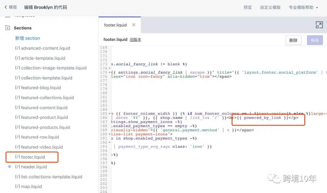 ② 然后,在模板目录里面的 Sections文件夹里,找到 footer.liquid 文件,更改 {{ power_by_link }} 这里的代码就可以了,改成你的域名即可