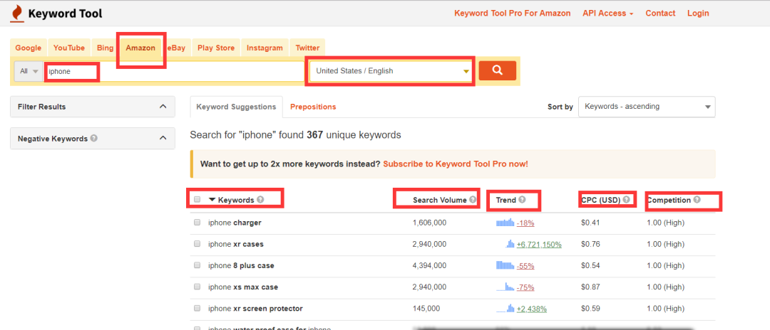 优点:功能强大,amazon/google/youtube/bing/instagram等平台关键词一网打尽,还能提供关键词搜索量,搜索趋势,CPC参考,对运营有非常大的帮助。缺点:费用高,挖掘不到太多关于“+词根”或“+词根+”的关键词,在这方面稍差一些。