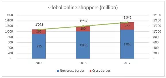 下图给出了2015年-2017年全球境内、跨境网购人数及变化趋势。