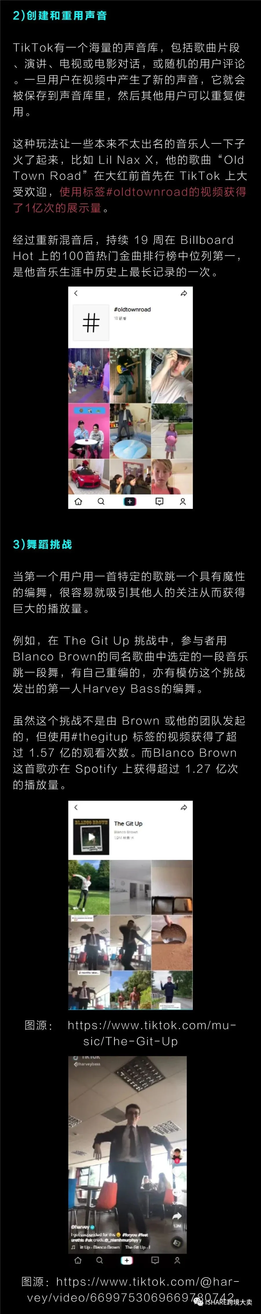 TikTok广告可以分为官方付费型和非官方付费型。 官方付费:in feed、Brand hashtag、Branded Effect、Brand over、Top view平台特色创作广告:网红合作、soundtrack、舞蹈跟拍、duet 视频。 官方付费广告 1) In-feed 广告 In-Feed广告即信息流广告,当你滚动浏览For You页面时出现在用户视频之间的视频广告,类似于刷Instagram快拍时看到的广告。 广告案例: 美宝莲创作的in-feed广告配上朗朗上口的音乐,提高他们在日本年轻一代中的市场额和品牌知名度。 广告还可以在视频底部放call-to-action的按钮。例如,引导用户即可下单or下载APPor直接跳转到你的网站。 2)品牌Hashtag挑战广告 在品牌标签挑战中,品牌可以要求TikTok用户根据要求表演的方式拍下来,比如编排好的舞蹈,然后用特定品牌Hashtag发布。 3)Brand Takeover广告(品牌开屏广告) 每当打开app,就会立刻显示出来的广告就是Brand Takeover广告。Brand takeover是三到五秒的全屏视频广告。 这类广告不仅会在用户打开app时立即显示,而且还可以作为静态图片、GIF 或视频出现在 “For You”的推荐页面上,品牌可以放一个可跳转的Hashtag或网站链接。 4)TopView广告 TopView广告是基于In-feed广告和Branded Takeover广告结合变化后的广告。 5)品牌特效广告 品牌特效广告类似于Instagram的AR滤镜,用户可以将这些特效添加到自己的视频中。 创意广告 打广告的最终目的是让素材尽可能触达最大面积的客户,让新客户群体知道了解你的产品。除了烧钱外,你还可以表达创意。 tiktok官方广告目前费用都偏高,且不一定适合每个人,但是利用tiktok自带的视频特色,结合自己产品特色,通过用户的转发和评论引发群众反响的方式,同样走出广告效果。 与传统社交媒体不同,TikTok 的热门趋势内容更新得非常快,有些话题可能这一周流行,下一周就不流行了。紧抓潮流趋势,利用当前热门话题内容制作视频可以很巧妙地蹭一波免费流量。 与网红合作 你可以在发现页面的用户标签中找到各种各样的网红。只要在搜索栏中输入一个主题,就可以马上查到他们的粉丝数。点击他们的资料页面,就可以找到其他数据,比如有点击量、观看量。 除了传统的雇佣网红拍摄产品review视频,很多品牌会选择利用上面所说的三种TikTok玩法跟网红合作。 TikTok现在还给品牌和网红合作提供一站式服务的工具Creator Marketplace。通过这个工具可以利用实例和数据搜索完美的网红进行匹配合作。 无论是官方付费广告还是自主创意视频,都需要重视其内容创作及创意。好的内容创作,无需付费,用户跟着广告跑,因此,tiktok归根结底是内容内容内容。