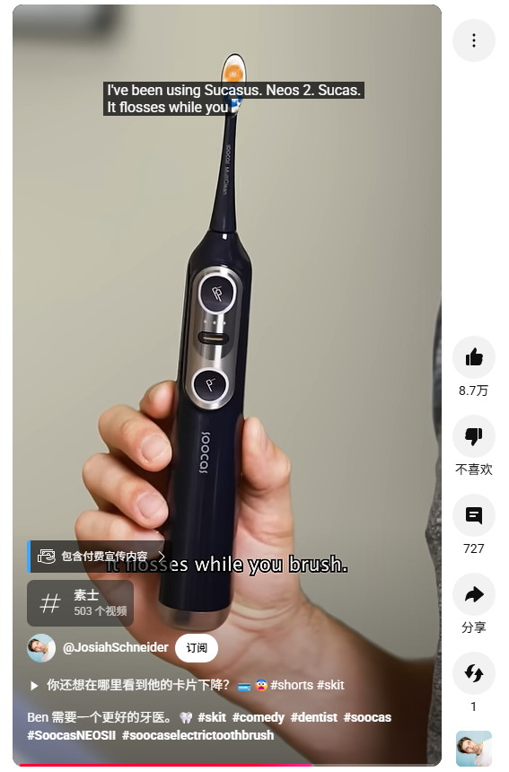 如果说 TikTok 负责 “让用户知道 Soocas”,YouTube 则负责 “让用户相信 Soocas 值得买”。针对 YouTube 用户 “注重专业度、需要深度信息” 的特点,Soocas 选择 “情景剧情 + 对比评测” 两条路,把 “信任” 做进细节里。