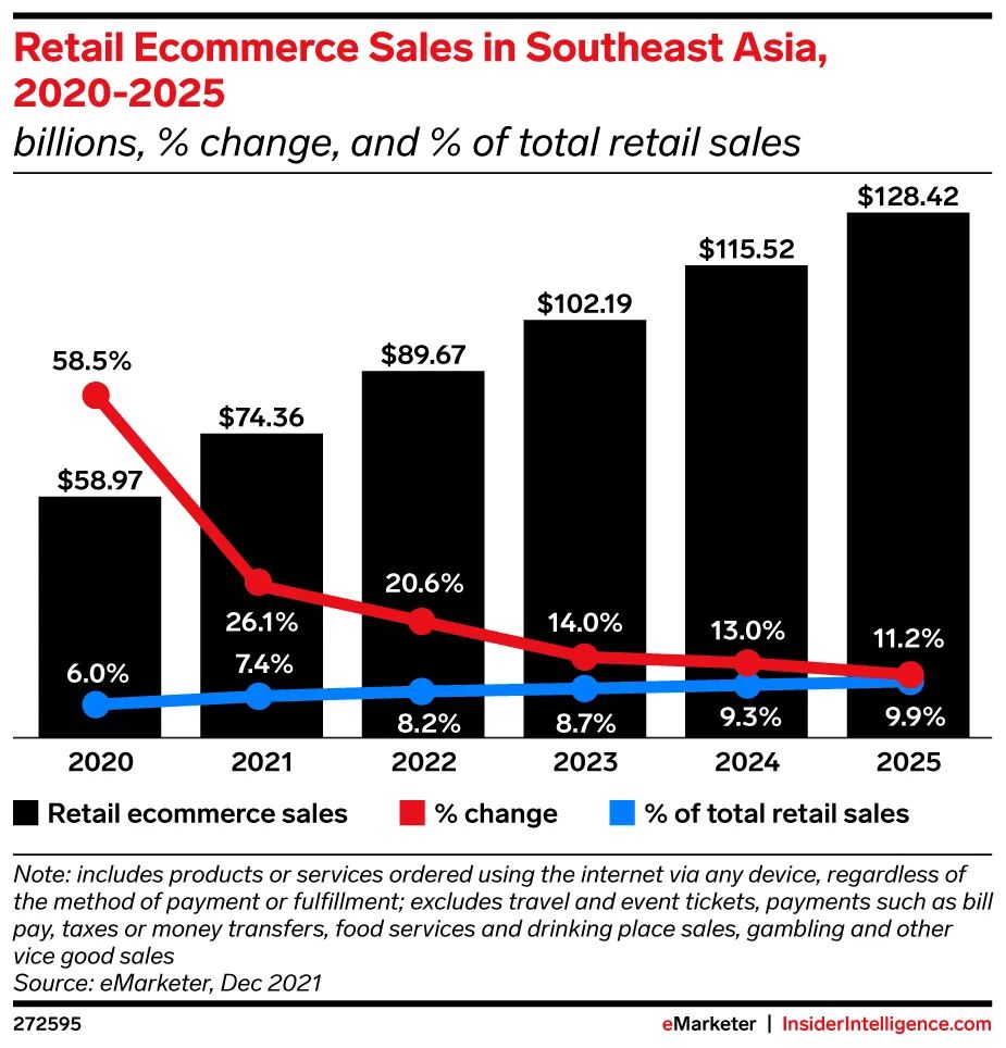 eMarketer数据指出,2022年东南亚地区的电商销售总额将达到896.7亿美元,到2023年将突破1000亿美元大关。