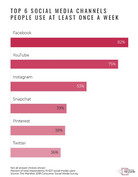 大多数美国民众保持使用多种社交媒体渠道,但Facebook仍然是王者——82%的社交媒体用户每周至少访问一次Facebook。
