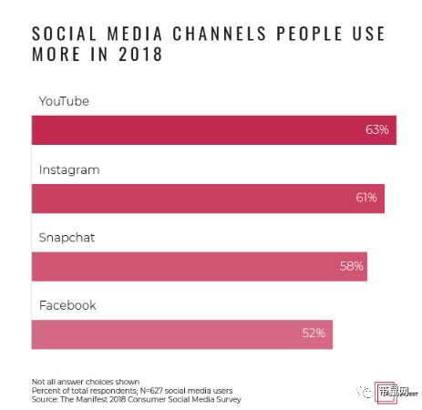 相比之下,75%的人每周至少使用一次YouTube,53%使用Instagram,39%使用Snapchat,38%使用Pinterest,36%使用Twitter。虽然Facebook仍然是最常用的平台,但其他社媒正在迎头赶上,特别是YouTube和Instagram。当被问及2018年有哪些社媒渠道被使用更频繁时,调查受访者表示是YouTube(63%)、Instagram(61%)和Snapchat(38%)。