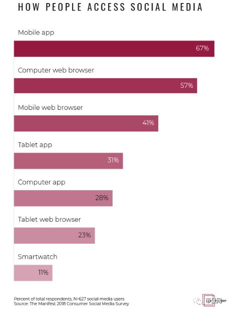 通过平板电脑应用(31%)、计算机应用(28%)、平板电脑浏览器(23%)和智能手表(11%)访问社交媒体的人数相对较少。