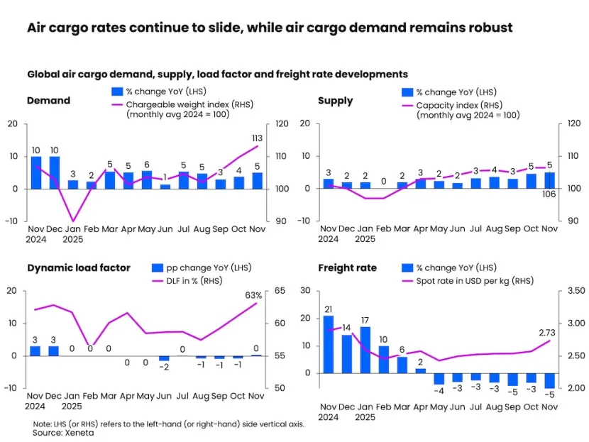 这一背离表明,航空公司正在以牺牲价格纪律为代价追求市场份额,在本就低迷的市场中进一步压缩收益。11月,全球航空货运现货价格环比上涨6%,较去年同期9%的涨幅有所放缓。
