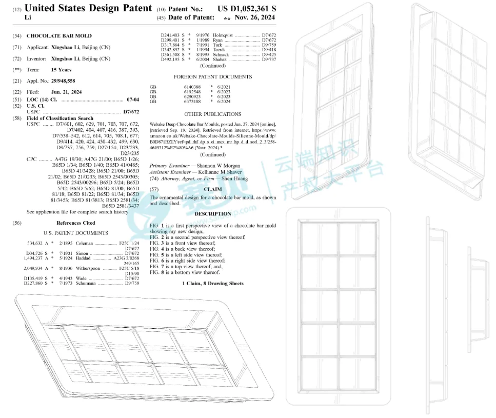 案件涉及原告名下有美国外观设计专利US D1,052,361 S,专利名称为 “CHOCOLATE BAR MOLD(巧克力棒模具)”,2024年6月21日申请,2024年11月26日正式授权。赛贝提醒只要产品外形与专利设计相同或近似,即便附加了额外设计元素,也大概率会被认定为侵权。