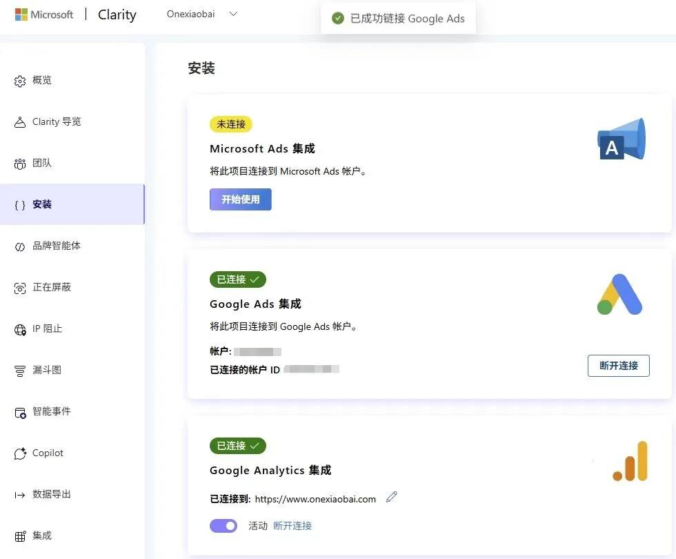 Clarity 可以与 Google 广告账户集成,关联 Google Ads 后台广告活动进行数据分析,