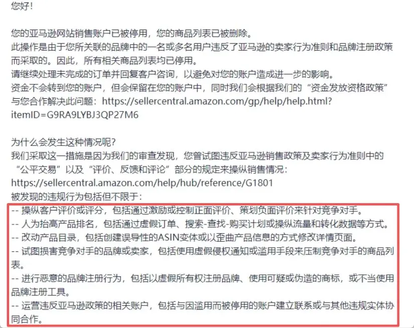不少卖家已经陆续收到封号邮件,违规原因基本集中在几类:操纵评论、人为拉升排名、滥用品牌、篡改信息等。