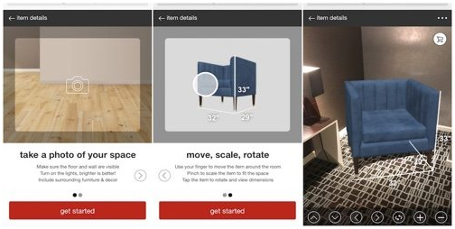 这项功能目前只支持Target的200种“Project 62”品牌家居产品。用户只需在Target移动端网站的产品详情页面点击“See It In Your Space”按钮,随后,拍一张自己房间的照片,就能使用方向箭头和其他控制功能、或通过在手机触屏上缩放和拖动被显示对象,观看的产品在房屋内的陈设效果,可以随意移动、缩放和旋转。