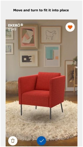 2017年9月,宜家宣布推出IKEA Place App,消费者想知道宜家的沙发、扶手椅、咖啡桌或其他家具在自己家里的摆放效果,只要拿出 iPhone 拍摄摆放家具的空间,再扫描纸目录里支持 AR 的产品,就可以利用 AR 技术将产品放到照片里。IKEA Place 强调所有支持 AR 技术的产品都是 1:1呈现真实尺寸,所以不用担心照片与实际产品不符。