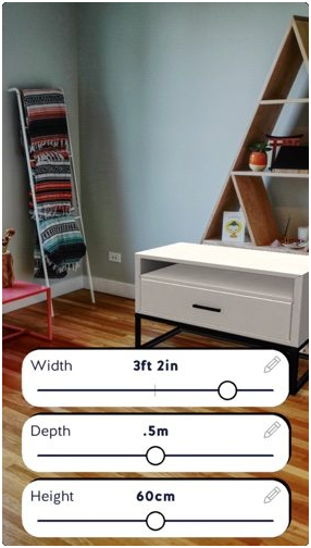 Chairish的AR功能和宜家的操作方式差不多。用户浏览某个商品时,只需点击“View In Your Space”按钮,就会将商品的2D图片叠加到移动设备的摄像头中。图片可以在触摸屏上进行放大缩小或旋转。用户不用手动去测量尺寸大小,每个商品的具体尺寸已经列出来了。