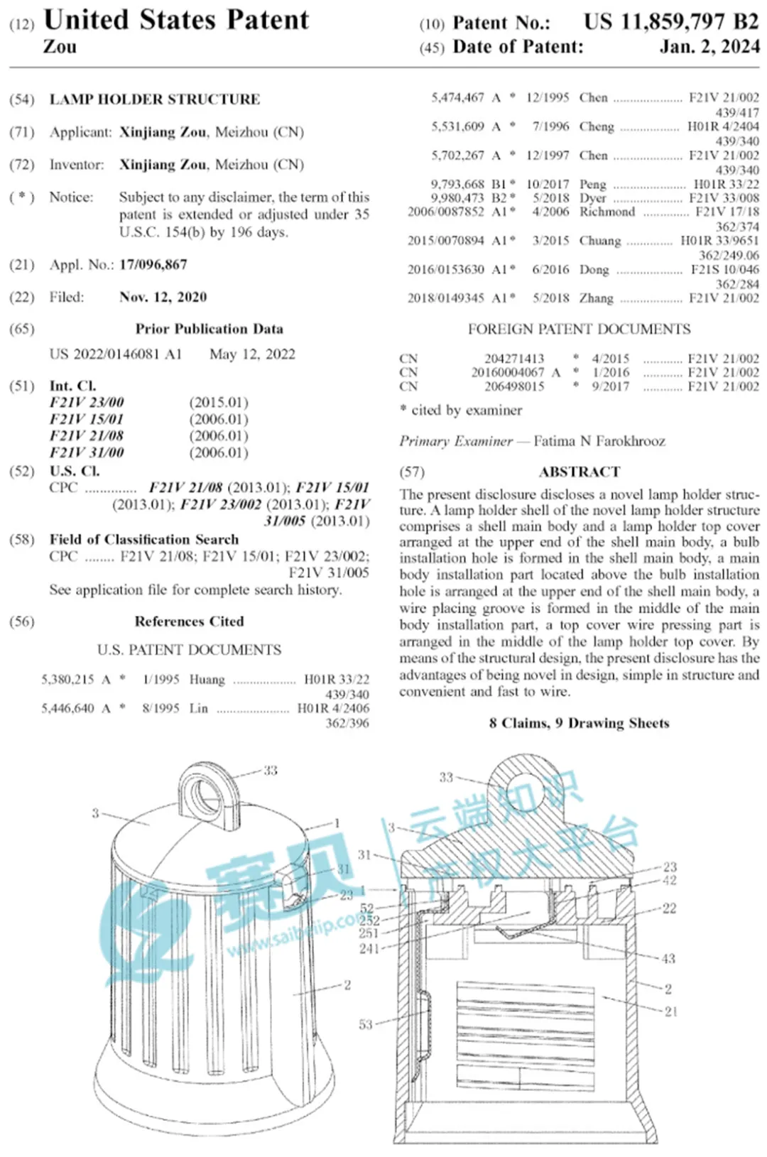 原告Xinjiang Zou为中国梅州人士,是创新灯座结构的研发者和专利权人,专注于灯座技术的创新与保护,核心成果为美国专利US 11,859,797 B2所保护的灯座结构。该原告具备明确的知识产权保护意识,已建立反侵权监测机制,通过主动线上排查,发现大量未经授权的电商卖家销售侵犯其专利的产品,进而发起本次诉讼。