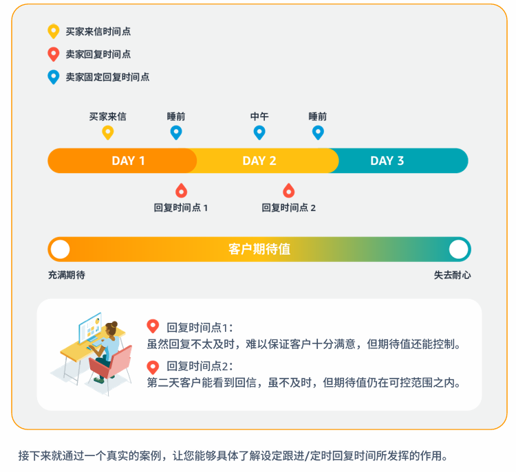 如果您暂时无法做到及时的售后响应,那么定时、定期的回应会是一个绝佳的解决方案。设定固定的回应周期与节奏,可以控制客户对商家回应的期待值。比如您可以在每天固定的时段回复客户,并且在回复中告知您的响应时间。亚马逊建议您在24小时内回复买家的所有电子邮件消息,以保障最佳的客户体验。