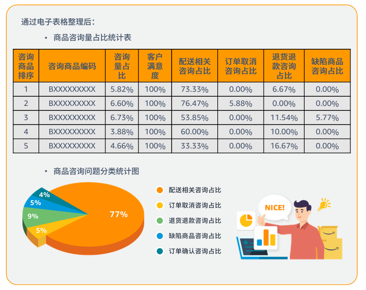 大家都希望把生意越做越好,那么您不单需要从销量来看店铺的经营,更要从用户角度出发,从客服的需求分析,才是把生意越做越好的关键!如果您能把客户服务记录通过电子表格来整理,那么就可以开始分析工作,开启数据的潘朵拉宝盒,客户的需求将会告知您店铺经营的方向,比如: