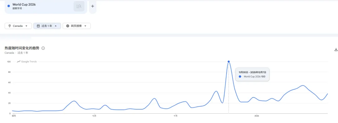根据谷歌趋势显示,“world cup 2026”从去年12月开始,相关搜索量就有了大幅的增长。