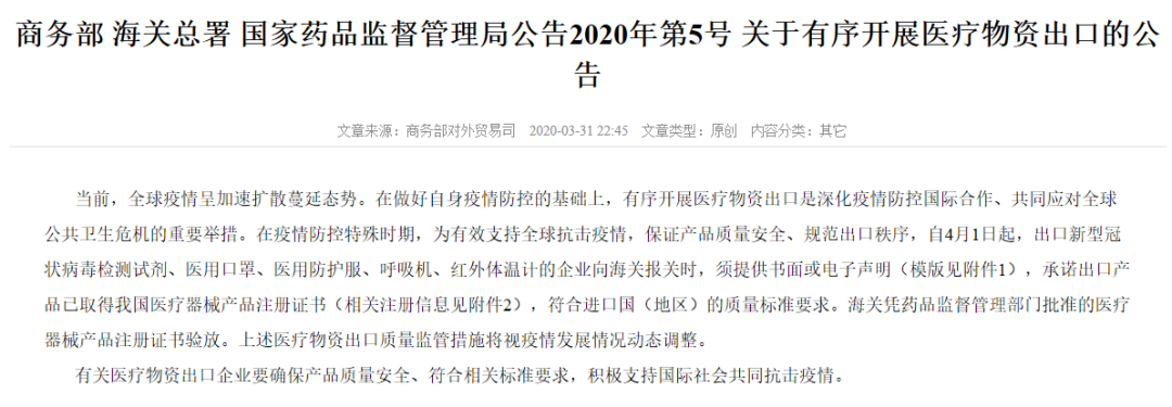3月31日,商务部、海关总署、国家药品监督管理局公告2020年第5号 关于有序开展医疗物资出口的公告: